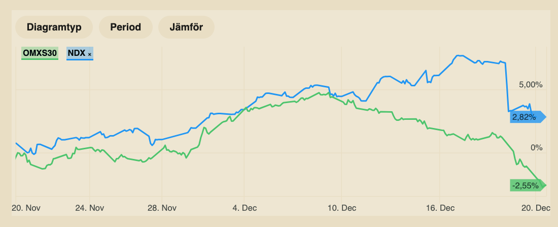 Efter det blev det onsdag. Klockan 20.00 på kvällen lämnade Fed sitt räntebesked och sänkte som förväntat med 25 punkter. Men det som blev en kalldusch för marknaden var att centralbanken guidade för enbart två räntesänkningar under 2025, i stället för de fyra som man tidigare sagt.