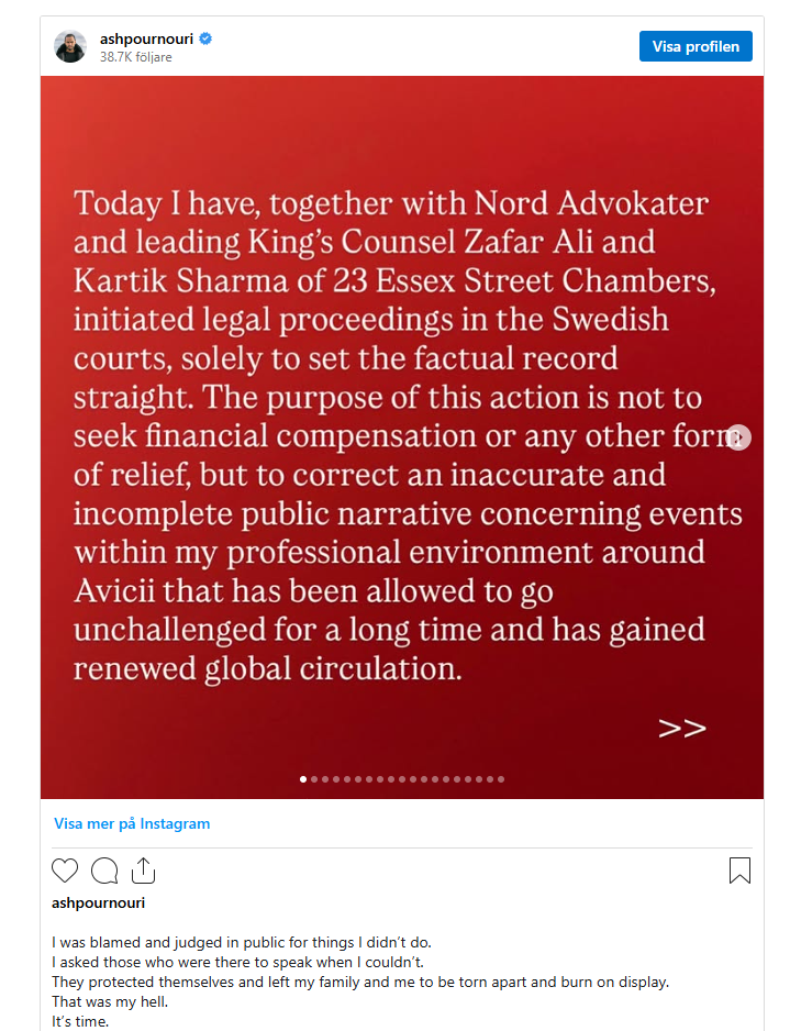 ”Syftet med denna åtgärd är inte att kräva ekonomisk ersättning eller någon annan form av gottgörelse, utan att korrigera en felaktig och ofullständig offentlig berättelse om händelser inom min professionella sfär kring Avicii, som har fått stå oemotsagd under lång tid och nu har fått förnyad global spridning”, skriver han på Instagram.