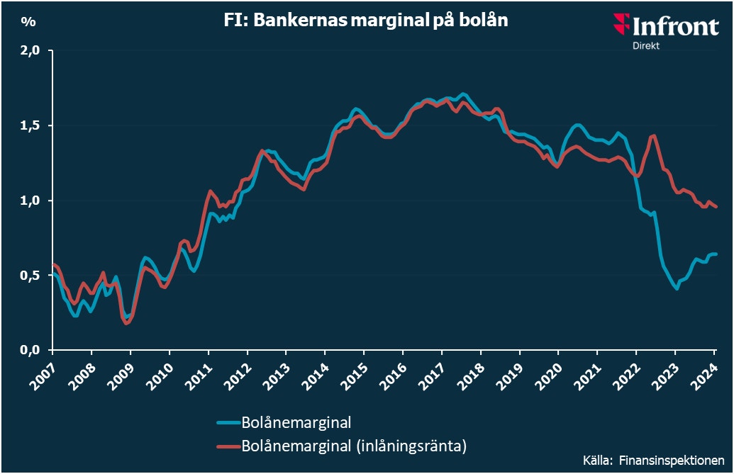 FI konstaterar att under kvartalet sänkte Riksbanken styrräntan med 50 punkter till 3,25 procent. Bankernas kostnad för att finansiera bolån minskade. Det gjorde även de rörliga utlåningsräntorna, men inte i lika stor omfattning. Sammantaget innebar det att bruttomarginalen på bolån ökade.
