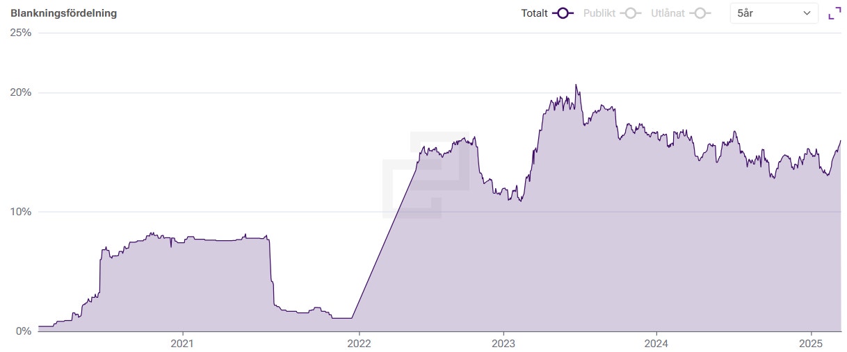 Samtidigt visar ägartjänsten Holdings statistik att blankarna tycks vädra blod igen för andelen kapital som är blankat har stigit rejält den senaste månaden. Från att ha legat kring 13-14 procent en längre tid har andelen nu stigit till 16 procent.