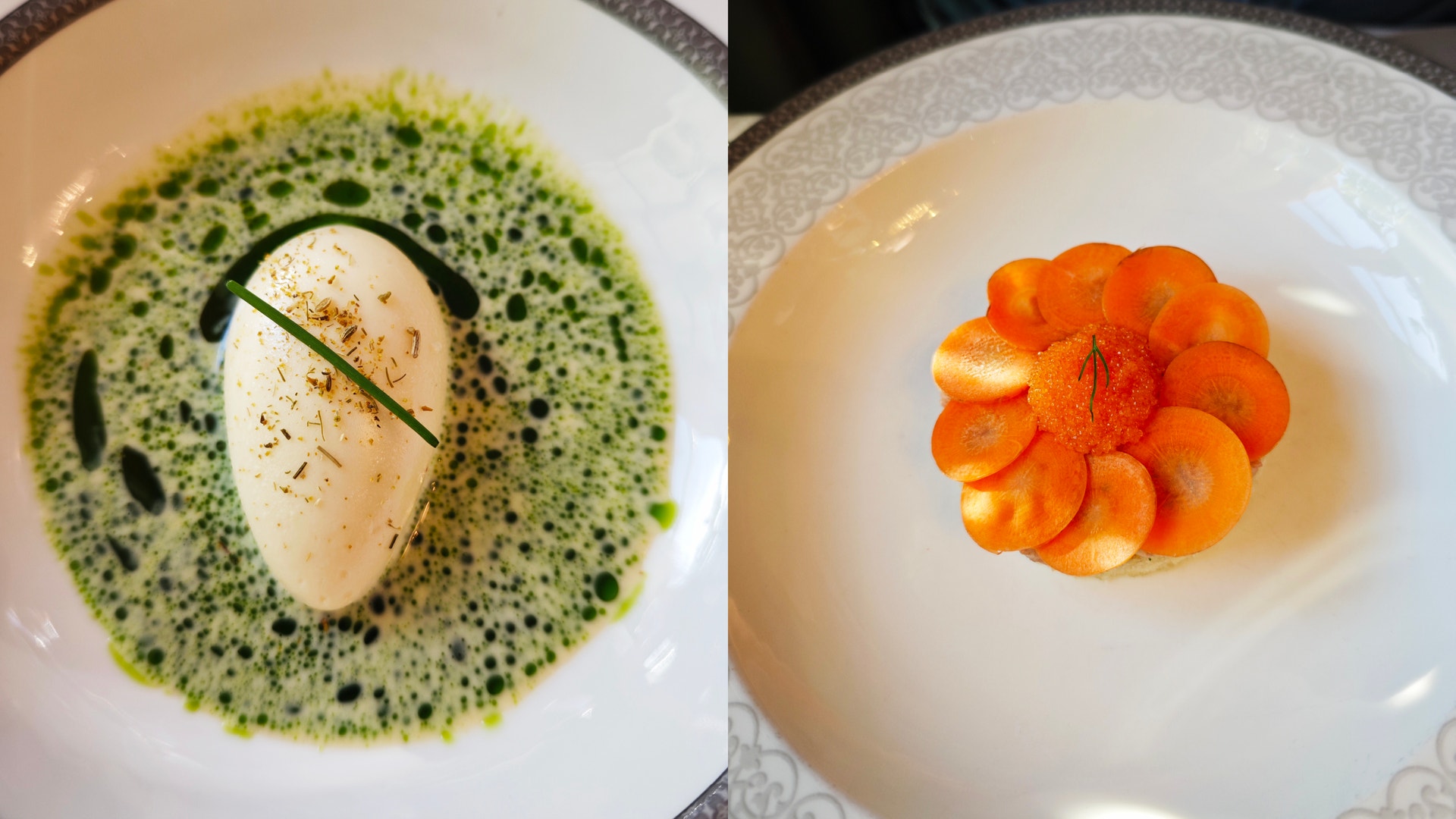 På våning fyra är det män som vill bli bekräftade av män som hänger. Presentationerna av rätterna är utsökta, jag menar alltså att uppläggningen är vacker. Blir lycklig av en quenell med kungskrabba och kammussla som badar i en ljuvlig vit-grön sås. “Ägget” slinker ner i tre ljuvliga tuggor.