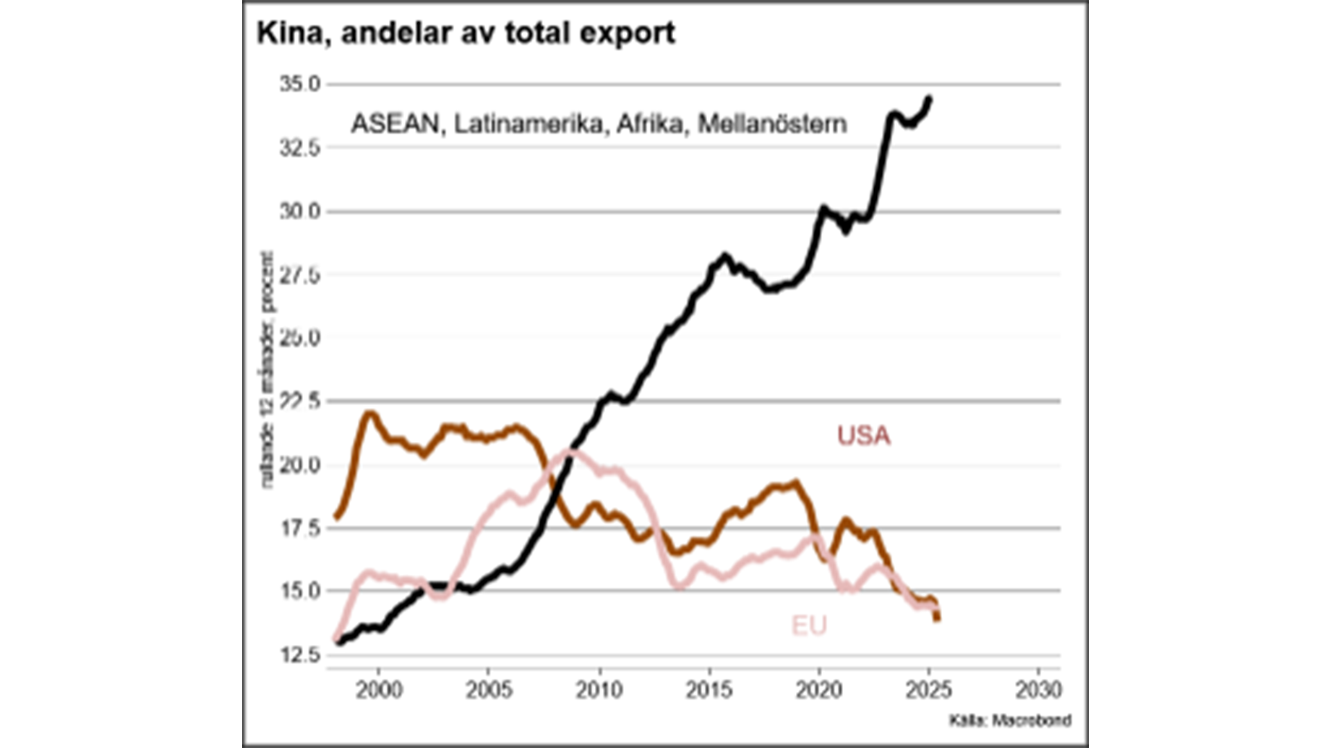 På mindre än två decennier gick USA:s import från Kina från så gott som obefintlig till nästan en fjärdedel av den totala importen. Den amerikanska marknaden kom därmed att betyda mycket för uppbyggnaden av den kinesiska exportindustrin. Sedan pandemin har emellertid USA:s importandel från Kina nästan halverats. Sett från Kinas perspektiv utgör exportandelen till USA numera endast 14 procent av totalen. ASEAN-länderna har passerat såväl USA som EU som den största exportmarknaden för Kina. I Latinamerika har kinesiska exportörer också skördat stora framgångar.