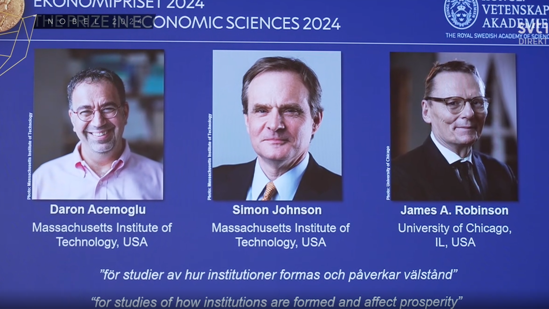 Daron Acemoğlu, Simon Johnson och James Robinson tilldelas Ekonomipriset till Alfred Nobels minne.