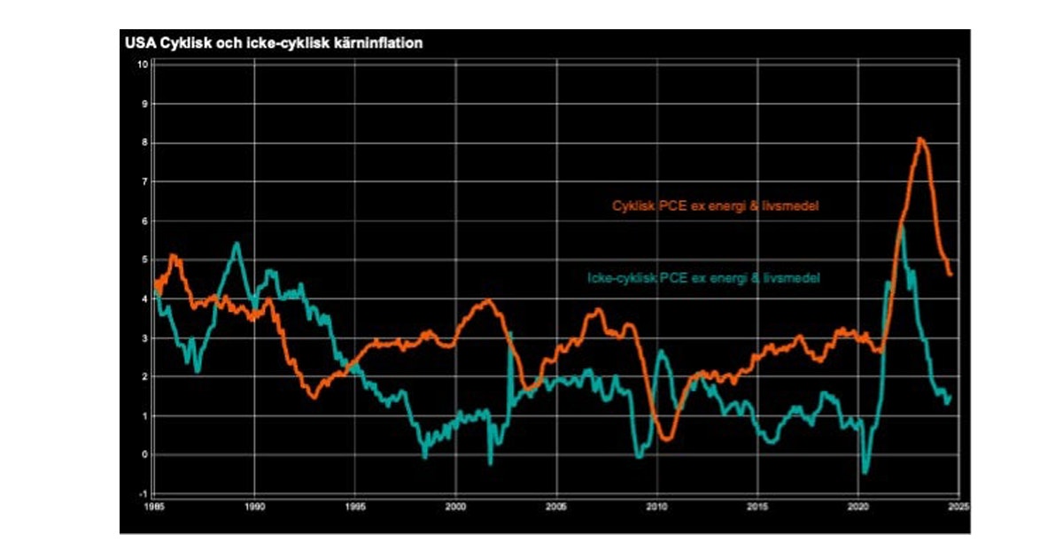 Inflationen har närmat sig målet men två tredjedelar av nedgången beror på faktorer som inte har med räntepolitiken att göra. Den del av inflationen som styrs av konjunkturen, den så kallade cykliska inflationen ligger på historiskt höga 4,5 procent. Det indikerar att ekonomin behöver kylas av mera för att målet ska nås. Ytterligare inbromsning är snarare önskvärd än något att oroa sig över. Om inflation och tillväxt håller i sig i höst kan Fed vila på hanen. Men om arbetslösheten skulle stiga är erfarenheten att man måste agera snabbt för att lyckas mjuklanda ekonomin. Därav Feds fokus på riskbilden.