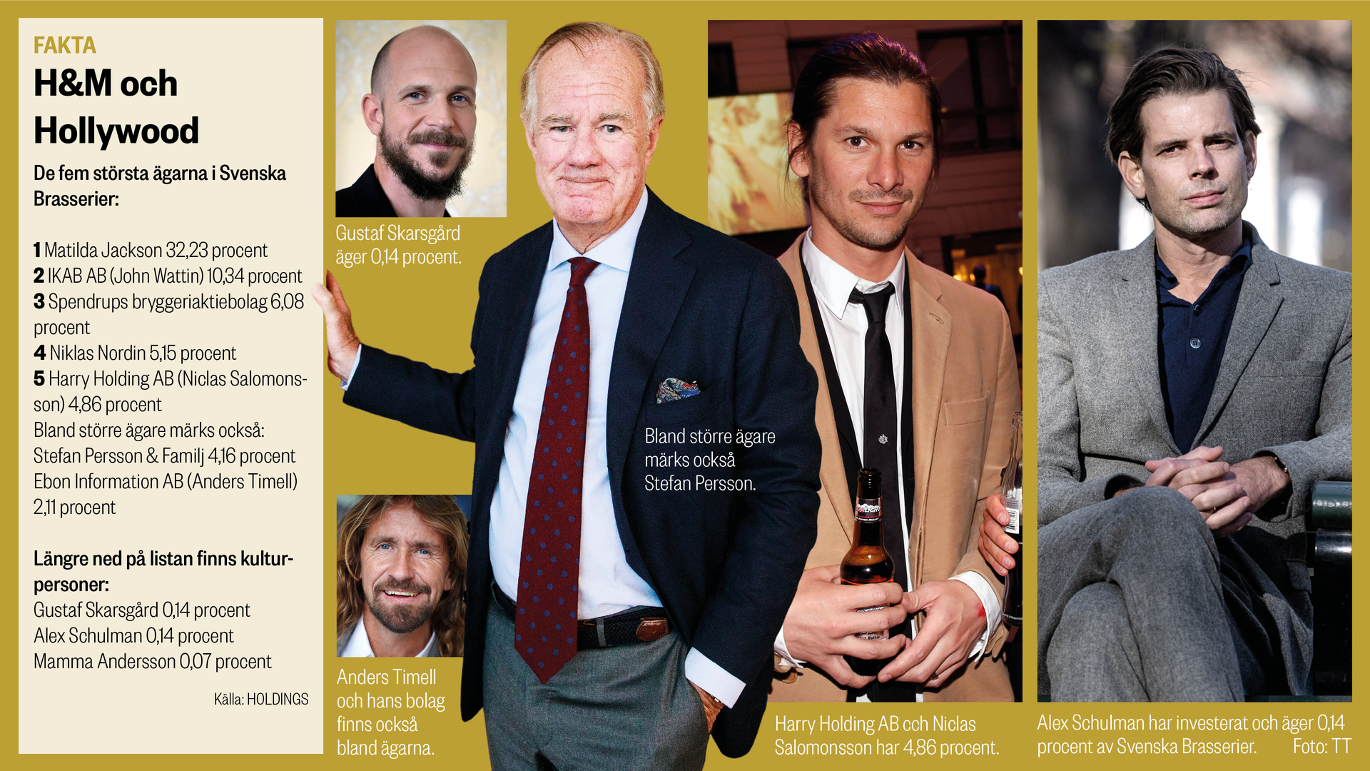 Också flera kulturpersonligheter har mindre aktieposter. Bland dem författaren Alex Schulman, konstnären Karin Mamma Andersson och skådespelaren Gustaf Skarsgård.