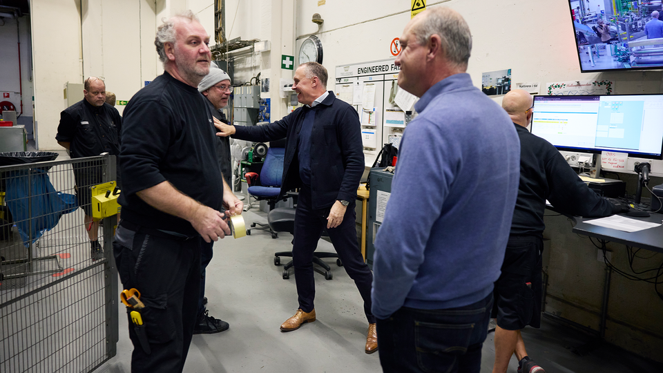 Han går vant fram till killarna i blåställ och skyddsskor som opererar maskinen. Klappar om några av dem, tar i hand och skämtar. Sedan rör han sig otåligt vidare. Pekar, gestikulerar och ropar för att överrösta maskinbullret.