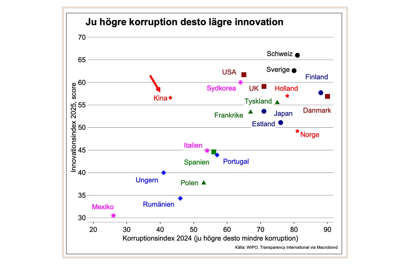 Några länder sticker ut. Trots en relativt låg nivå på BNP per capita ligger Kina högt upp i innovationsrankingen. Det kan bland annat förklaras av stora stödåtgärder i form av skattesubventioner, investeringsbidrag, marksubventioner och billig finansiering. Tyvärr har det inte bidragit till motsvarande produktivitetslyft, vilket en färsk studie från IMF visat (Industrial Policy in China: Quantification and Impact on Misallocation, OECD augusti 2025).