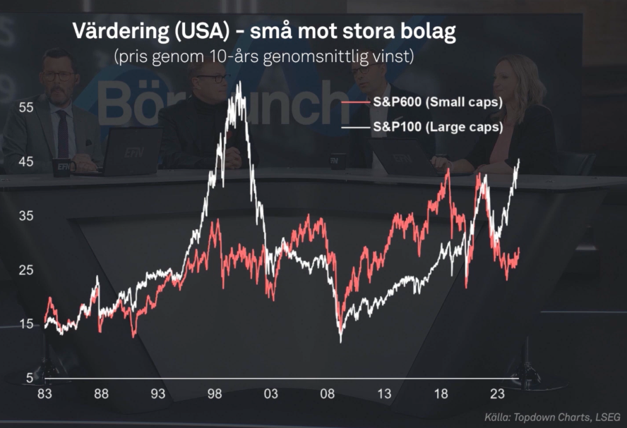– Och det hänger ihop med ränta och inflation. När inflationen stiger så tenderar stora bolag att gå mycket bättre. Och den här uppgången startade för flera år sedan och så har storbolagsbubblan fortsatt med inflationen. Men i USA nu så är det tio år som stora bolag har outperformat.