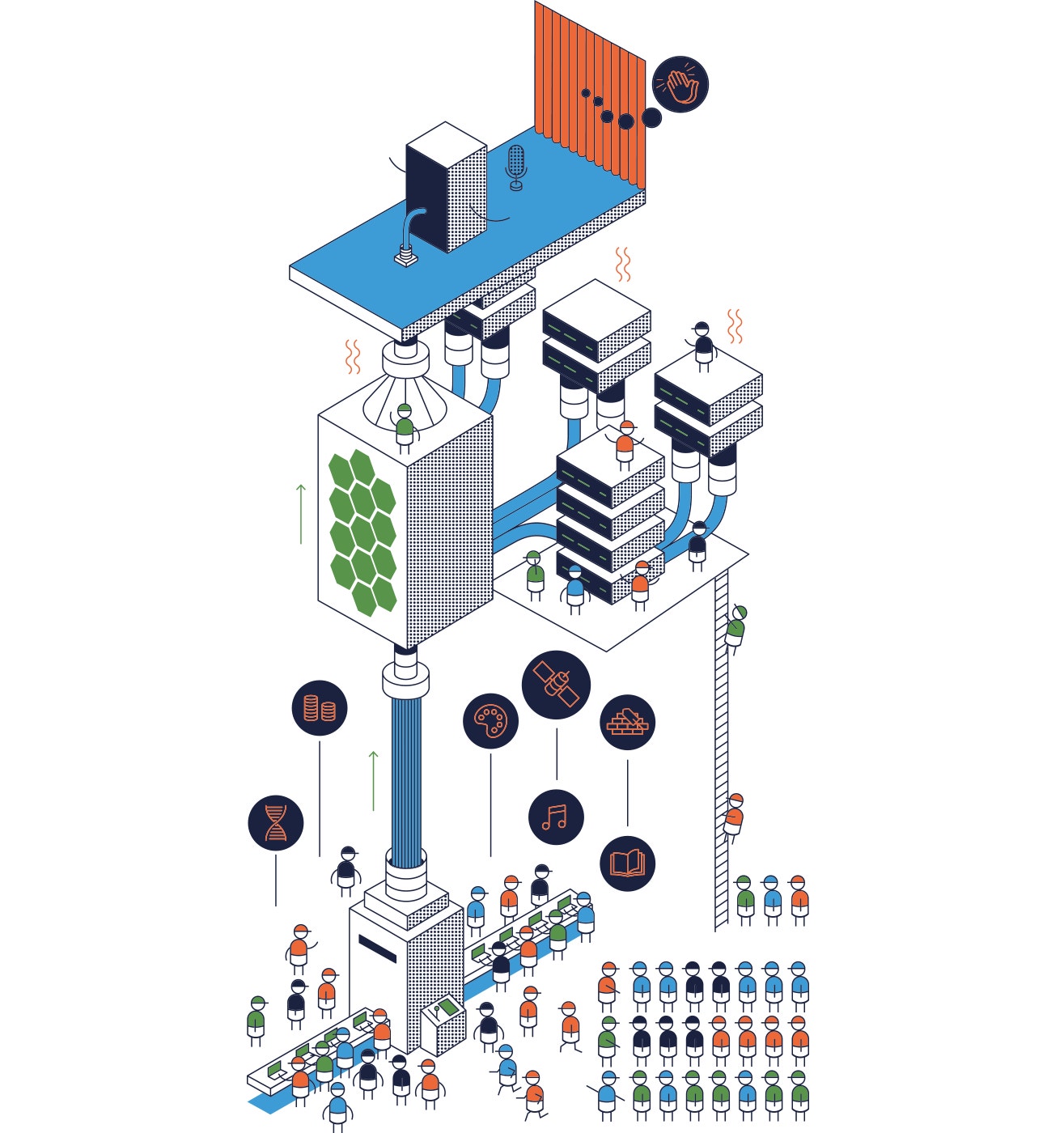 Digitaliseringens första epok visar samma mönster. Vid utvecklingen av MIT:s Whirlwinddator på 1940-talet var ritningarna fulla av streckgubbar som rusade mellan stationer med papper, film och magnetband i händerna. De var ”bärare av bärare”. Men i de flesta diagram av samma slag trollades människorna bort, det man ville visa var full automatik.