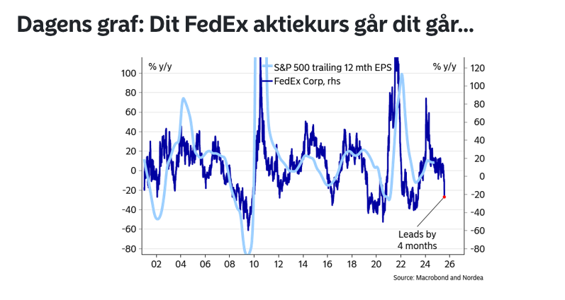 I sitt morgonbrev på måndagen skickade Nordea med en graf som visar på hur S&P 500 historiskt har följt Fedex trender på börsen.