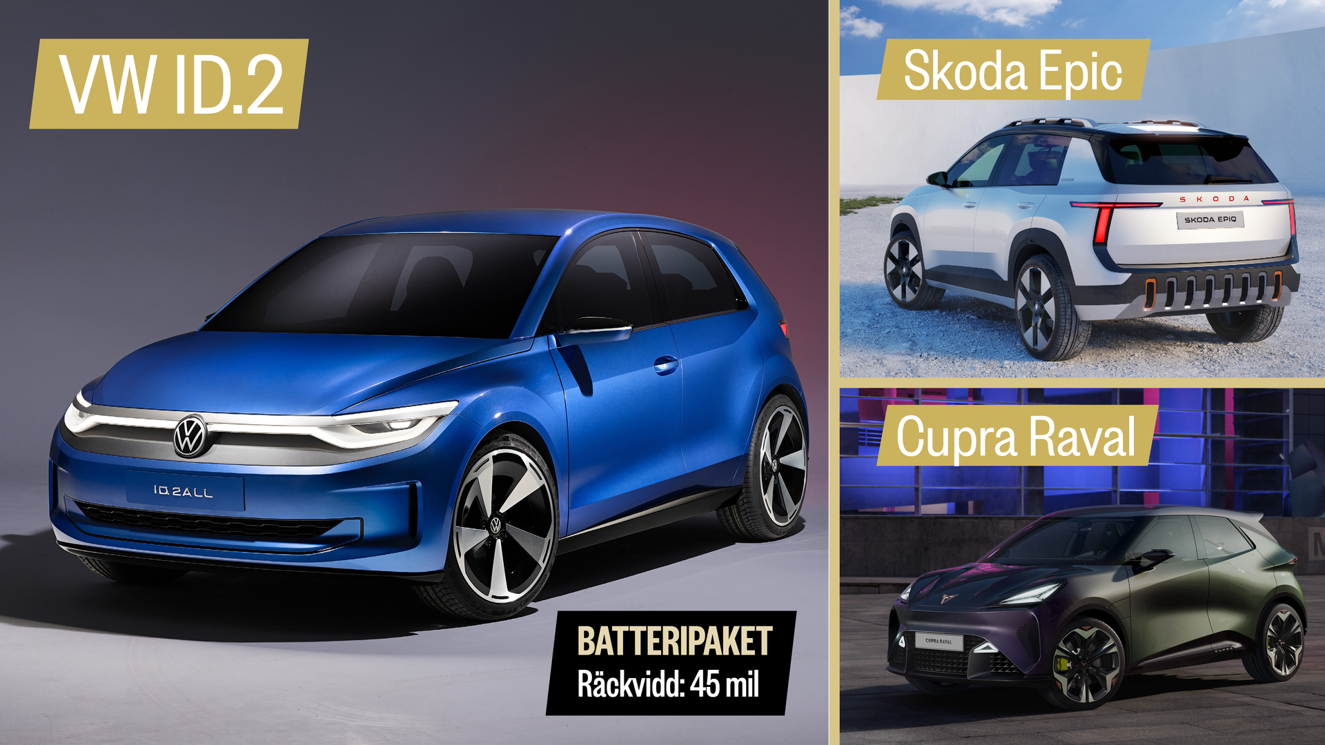 + VW ID.2/Skoda Epic/Cupra Raval kommer alla från Volkswagen-gruppen och möjligen är det inte helt korrekt att klumpa ihop modellerna, trots att en stor del av tekniken är gemensam. De ska exempelvis inte tillverkas i samma fabrik: ID.2 och Cupra Raval görs i Martorell utanför Barelona, medan Skoda Epiq görs i den förra Polo-fabriken i Navarra i Pamplona – där ytterligare en variant på ID.2 (troligen ID.2 X) ska göras. Bilarna är dock baserade på VW-gruppens MEB- bottenplatta, nu utvecklad till MEB Entry. Räckvidden för ID.2 ska bli hela 45 mil och laddeffekten är starka 350 kW. En annan imponerande uppgift: bagageutrymmet i ID.2 är 490 liter. Troligen lanseras alla tre bilar under nästa år. Prissättningen blir förstås intressant. Ett baspris på 25 000 Euro är har det sagts – men sedan då? Vilket av märkena blir billigast?