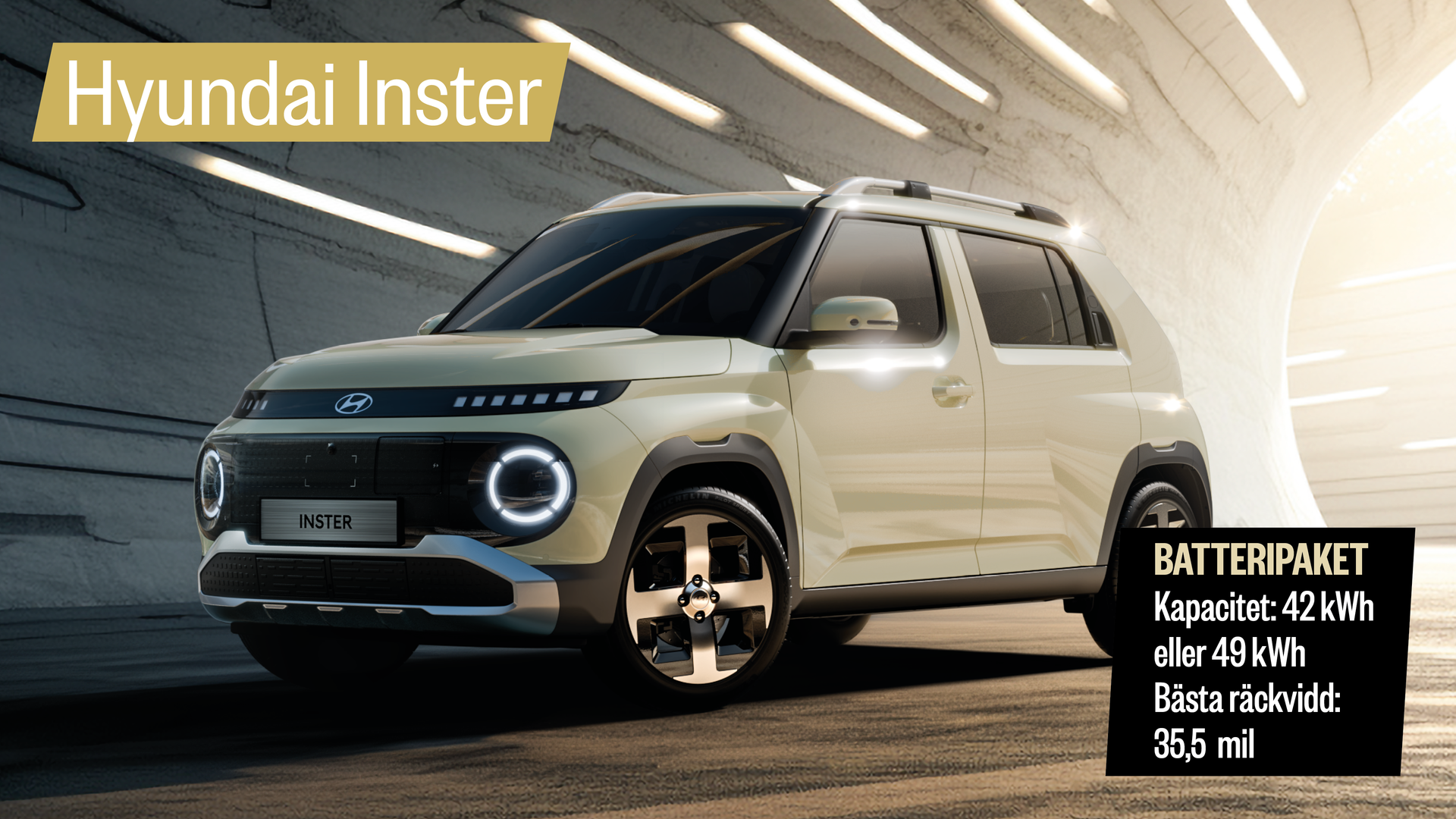 + Hyundai Inster är kort (383 cm), men hög (161 cm) och marknadsförs som en liten SUV. Men den är också smal: bara 161 cm, 16 cm smalare än Renault 5 – något man bör betänka som bredaxlad svensk. Interiören är dock flexibel genom att baksätet kan skjutas fram och tillbaka 16 cm, något som ger ett bagageutrymme från 238 till 351 liter. Två batteristorlekar erbjuds: 42 kWh eller på 49 kWh och två motorer, 97 eller 115 hk. Bästa räckvidd är 35,5 mil. Batteriet kan laddas med upp till 120 kW. Priset i Europa är 24 295 euro, vilket pekar på ett pris strax över 300 000 kronor i Sverige. Tillverkas i Sydkorea, inte helt klart när bilen når svenska marknaden.