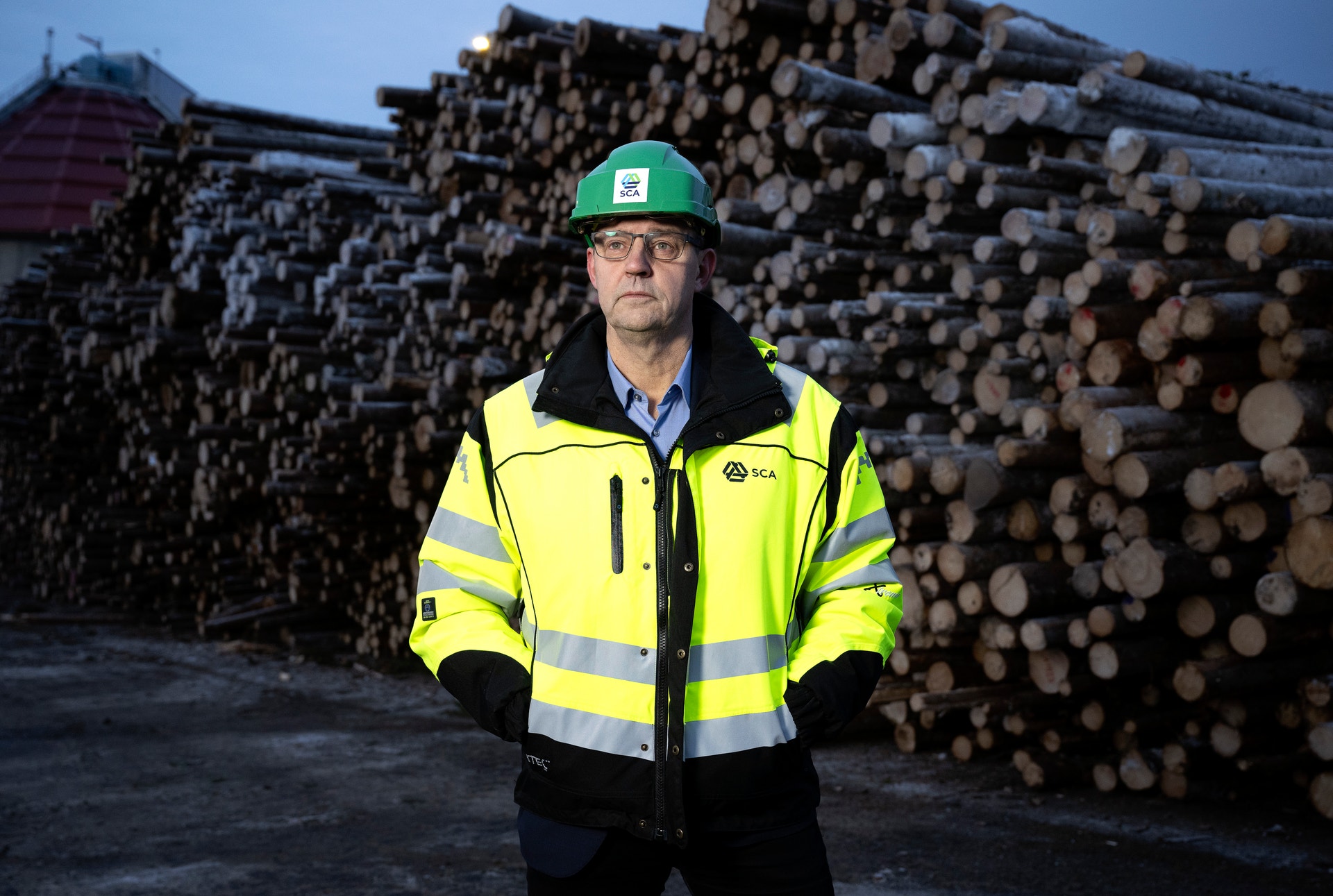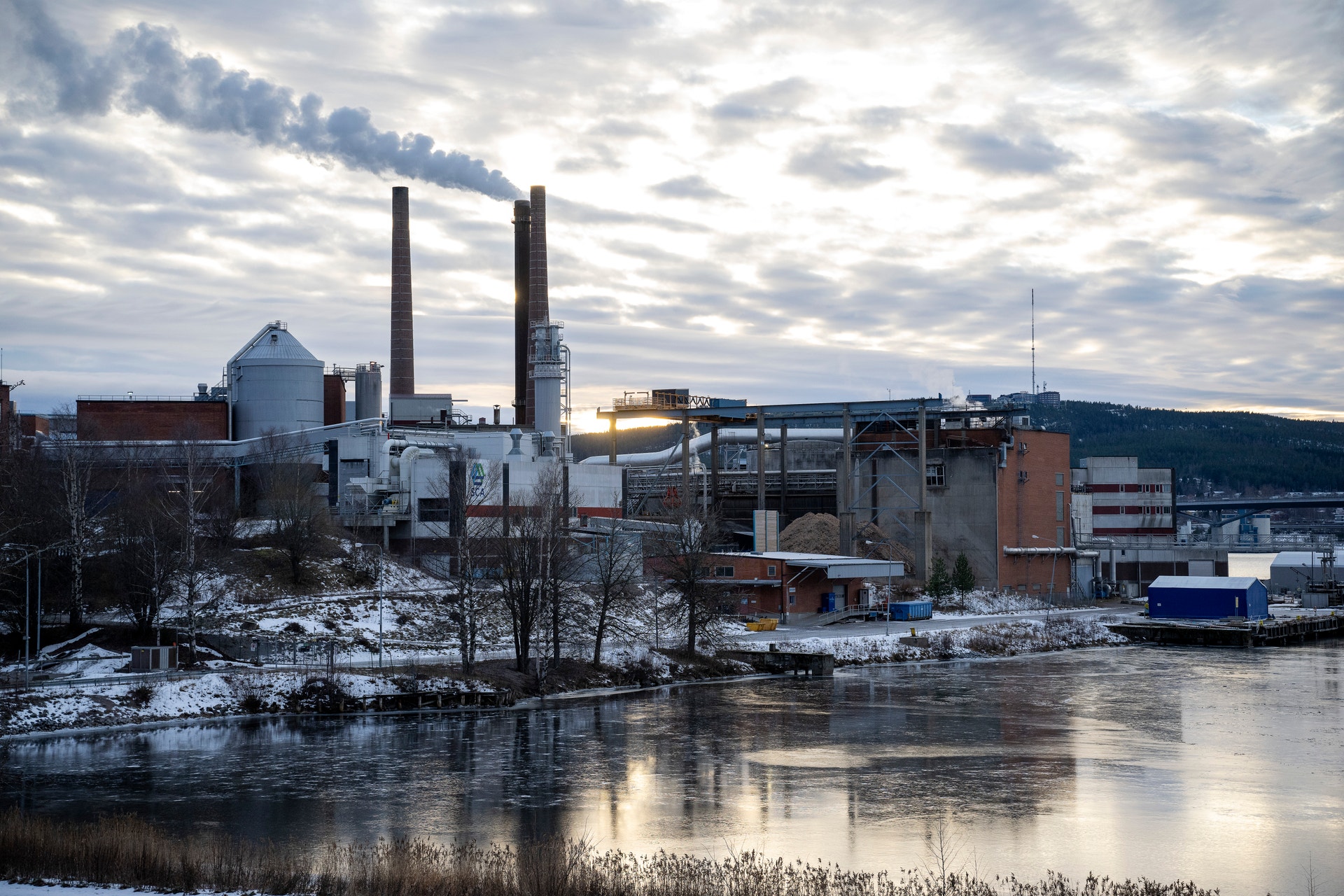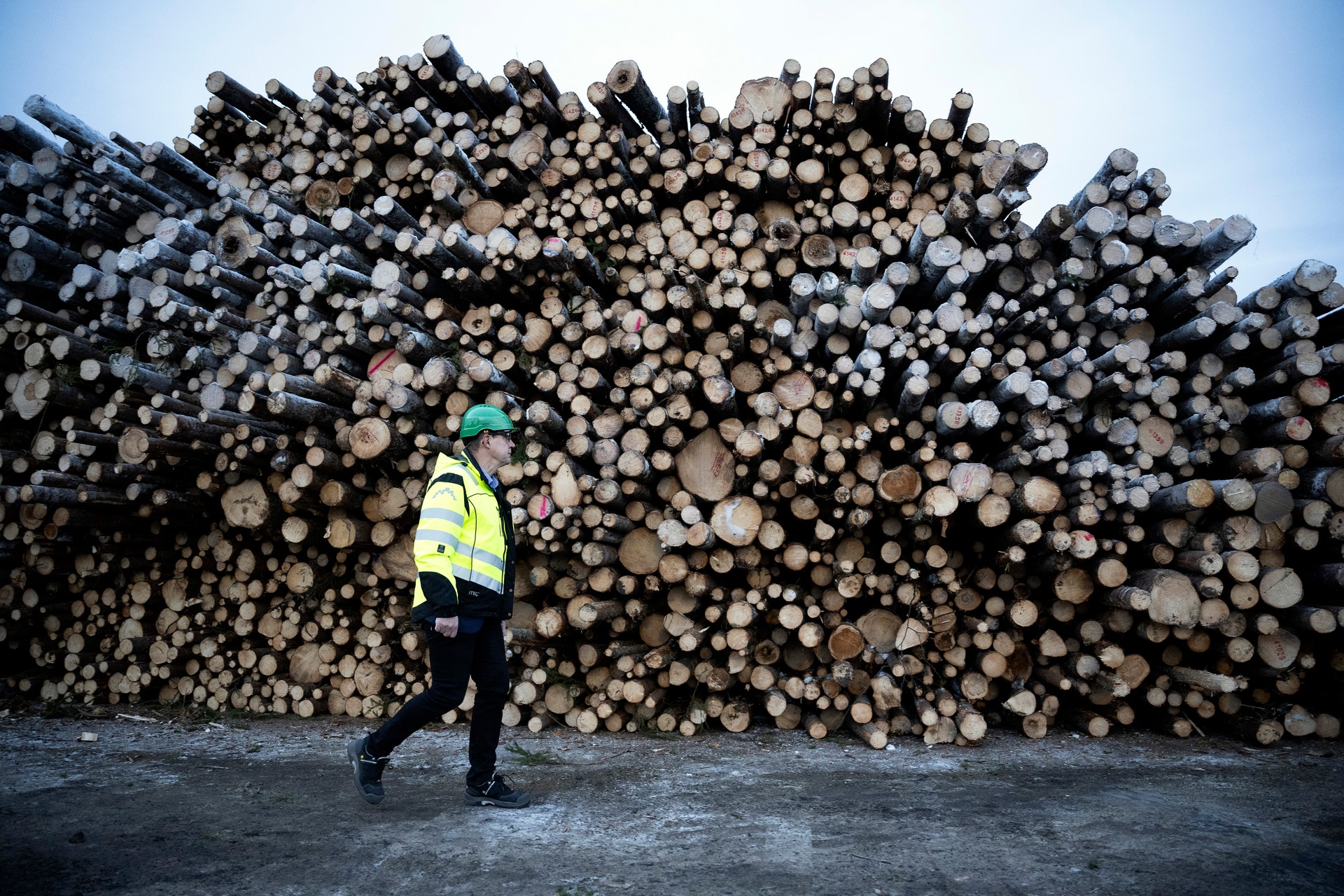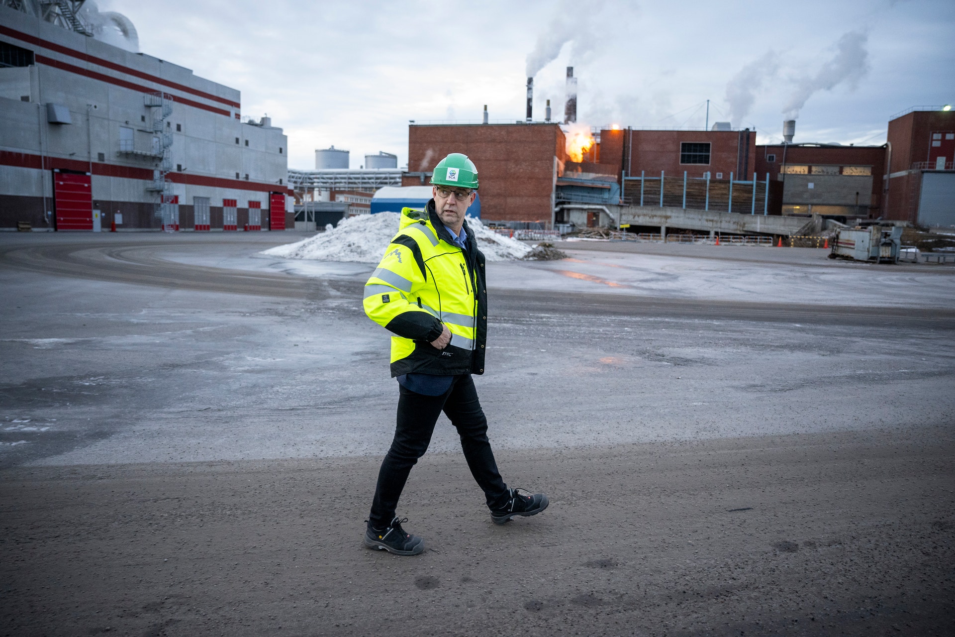 Fabriksområdet badar i motljus och Sundsvall har just presenterat 10 minusgrader när Sofia Burström tar täten som vår guide genom området. Nu är det kö med lastbilar som vill få det här klart innan helgen tar vid. Jag hinner se Ulf Larsson pilla bort lappen ”besökare” på hjälmen innan vi går mot timmeravlastningen. Betänk att det är dygnet runt som gäller här året runt. Björk och gran kan numera blandas i den nya massan.