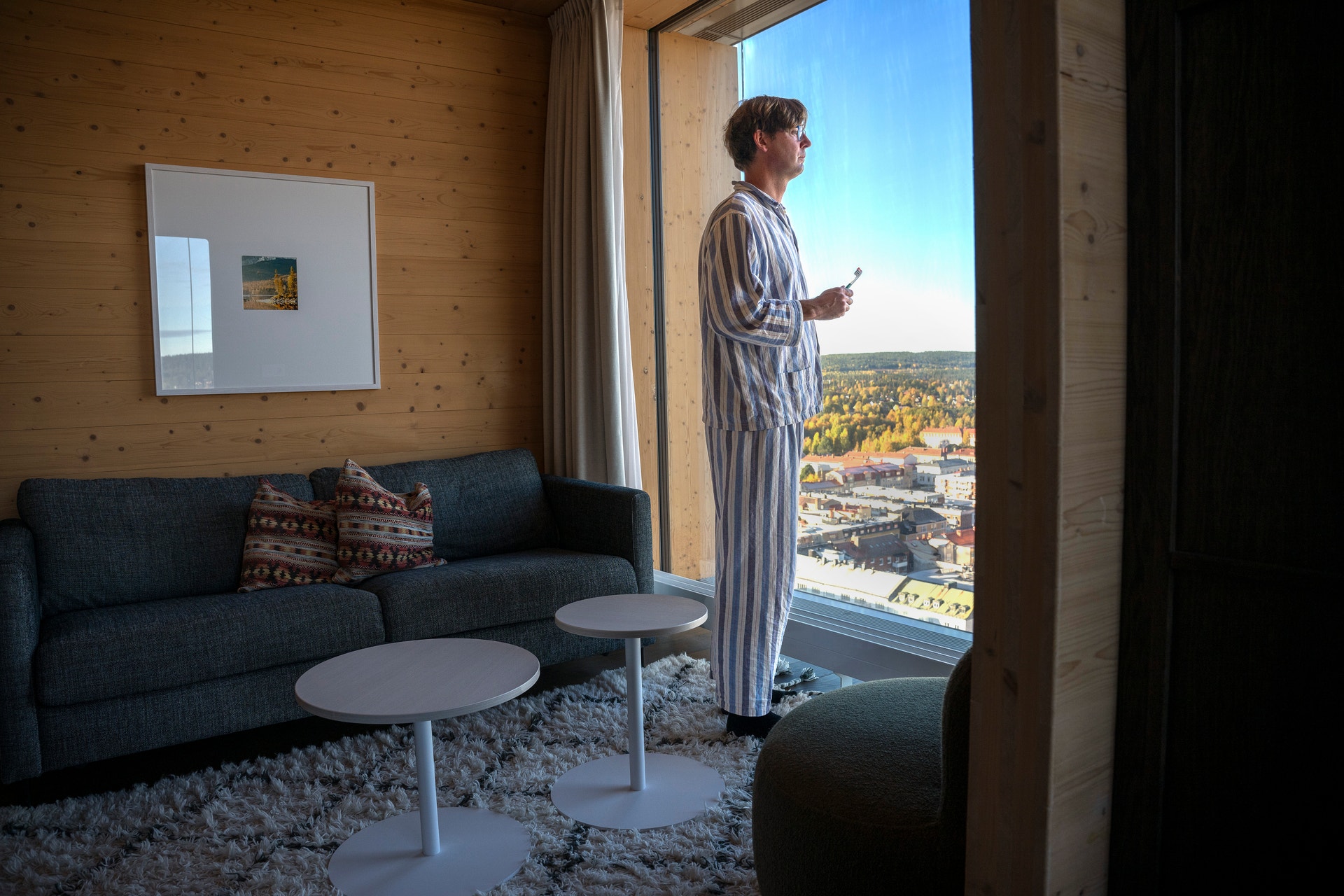 Vi bor på The Wood Hotell. Valet av hotell är egentligen givet. Det här 20-våningarskomplexet har mer än någonting annat tjänat som en symbol för den nya tiden i Skellefteå. Här bor de höjdarna. Visst, finns det andra hotell men det går ändå inte att jämföra med jättebygget The Wood Hotell.