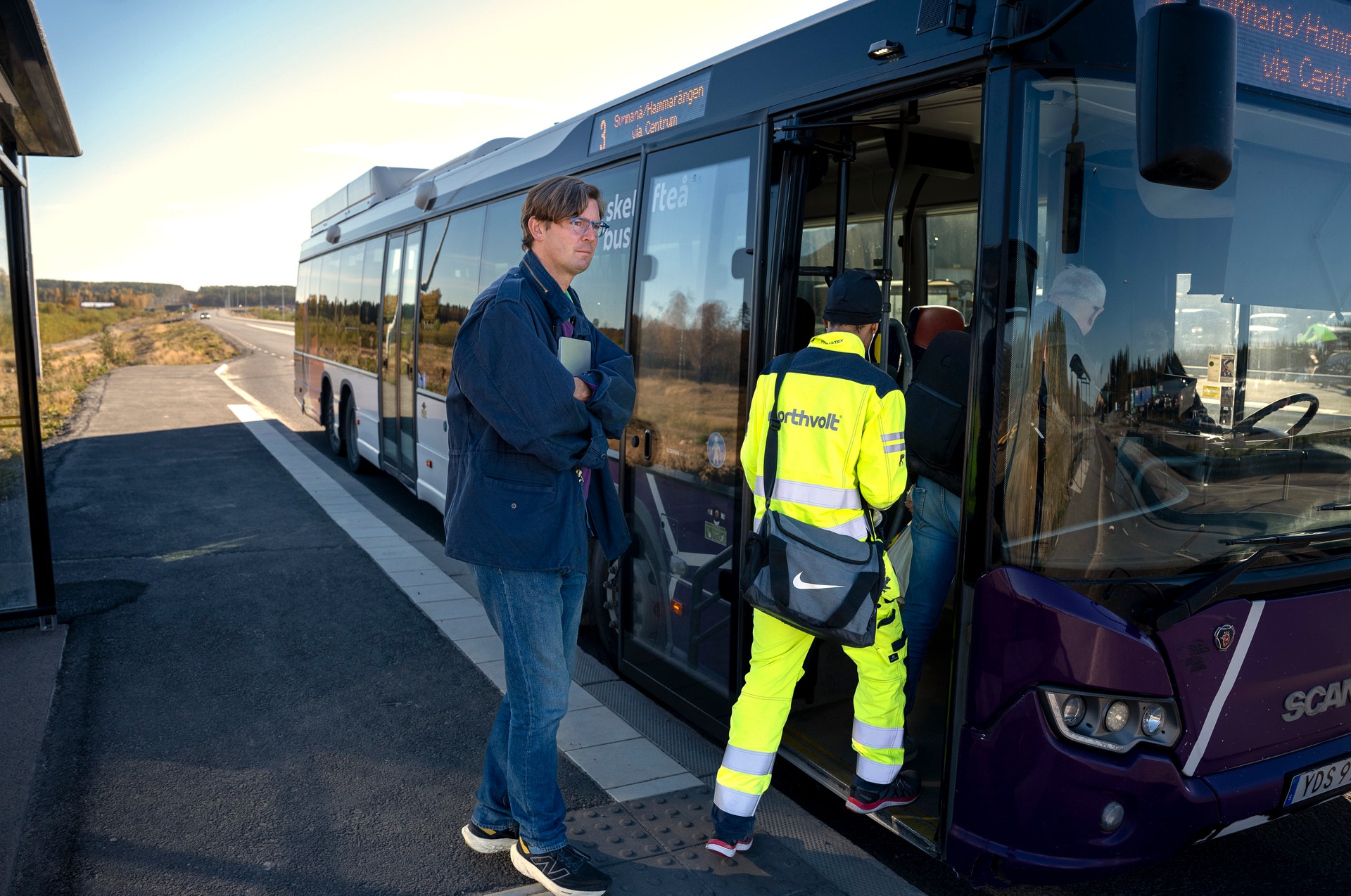– Men de lär ha dåliga maskiner därinne och sådant som inte alls fungerar men det är ju bara vad folk säger så det är ju bara som man spekulerar. Men det är klart vissa dagar är planen hit från Arlanda knökfulla och alla ska ut till Northvolt och sådana dagar kan man lika gärna tro att man är som i ett annat Chicago. Busshållplatsen är flyttad för att bygga det nya trähotellet och därför behöver det byggas ett nytt resecentrum och sedan ska E4 dras om och förändringar i Botniabanan men det är klart man undrar över Northvolt men det är ju bara som man spekulerar. Visst har jag kört journalister förut men inte Peter Carlsson. Har ni med er varma kläder?