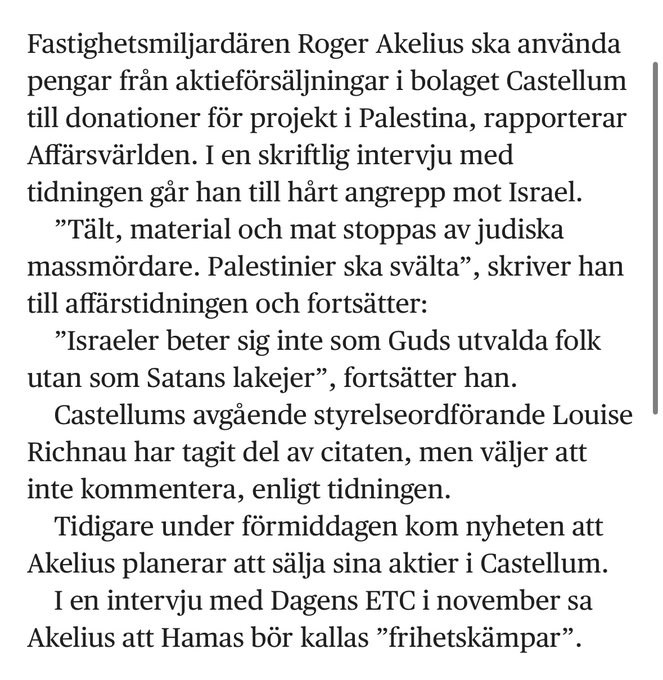 “Tält, material och mat stoppas av judiska massmördare. Palestiner ska svälta”, skrev Akelius och fortsatte sedan: