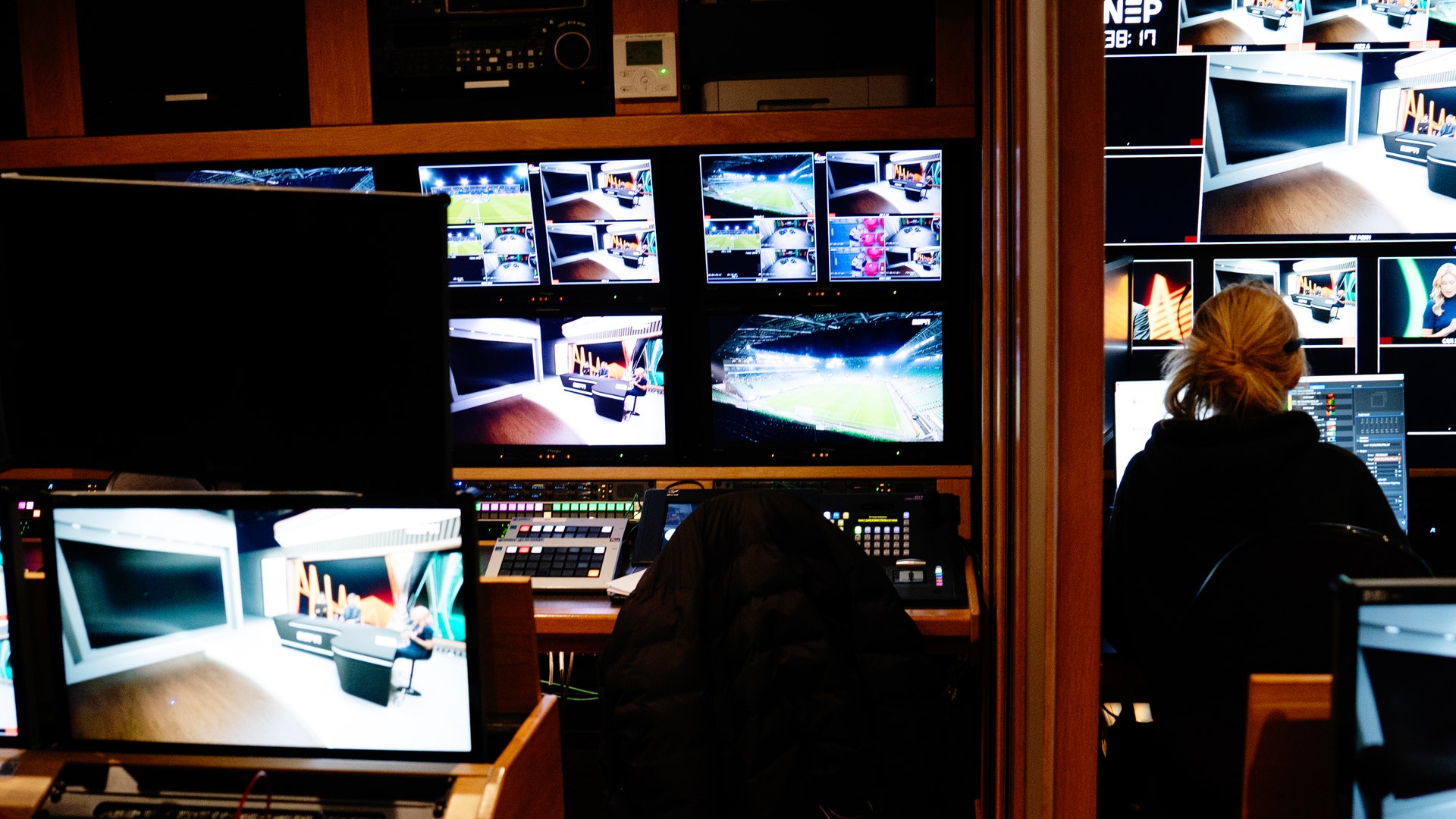 Ute vid tv-huset på Gärdet i Stockholm håller Disney Plus i gång två större studior för att bevaka samtliga matcher. Disneys stora sportvarumärke ESPN pryder sändningarna.