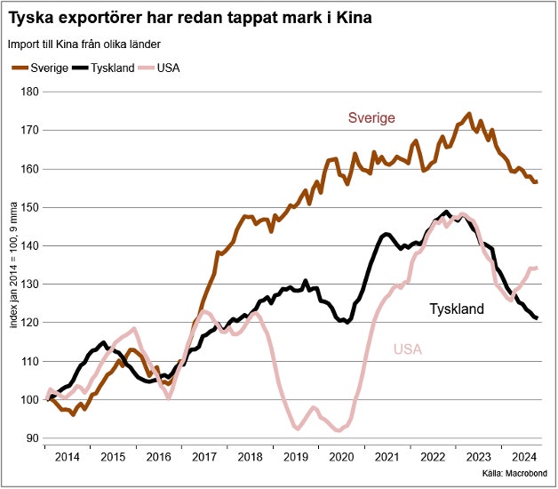 Europas ekonomier har många långsiktiga utmaningar relativt den amerikanska. Men på kort sig tornar nya orosmoln upp sig om USA inleder ett nytt handelskrig mot Kina. Vi ser det redan i konjunkturbarometrarna som svängt neråt efter presidentvalet. Det gäller särskilt exportberoende nationer, såsom Tyskland, som även är en av de ekonomier som påverkas mest av ökad kinesisk konkurrens på hemmamarknaden. Även i Europa behöver finans-och penningpolitiken bli mer expansiv vilket förstärker kontrasten mot USA-ekonomin som snarare skulle må bra av att hållas tillbaka.