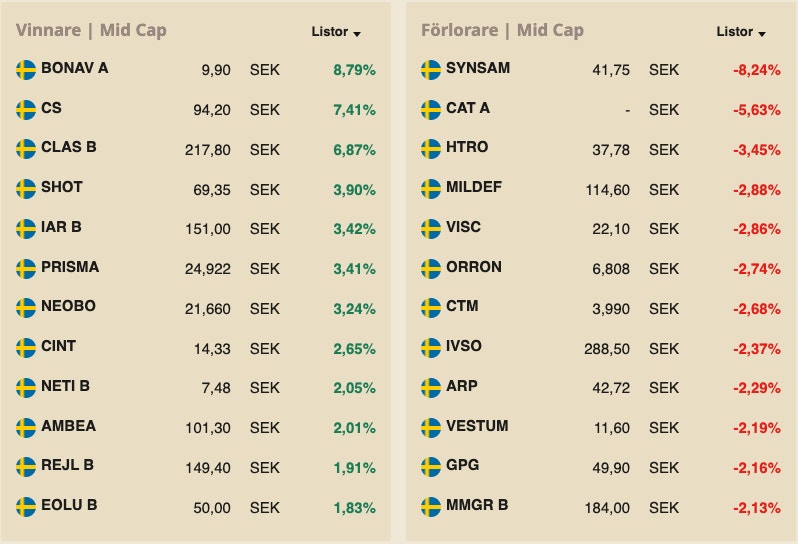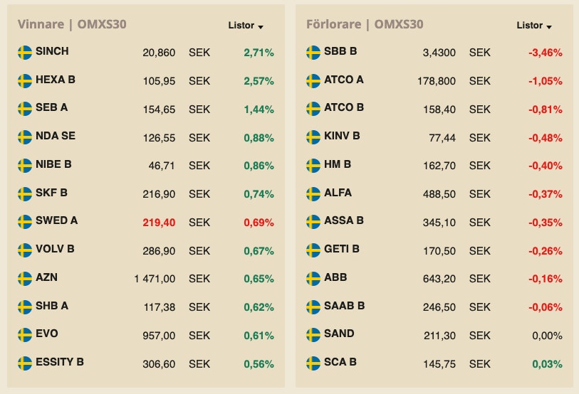 Sinch gick också starkt med en uppgång på 1,7 procent och storbankerna SEB, Swedbank och Nordea hade alla en bra dag på börsen. SEB stängde dagen 2,5 procent upp och de andra två kunde bokföra en uppgång på 1,7 procent.