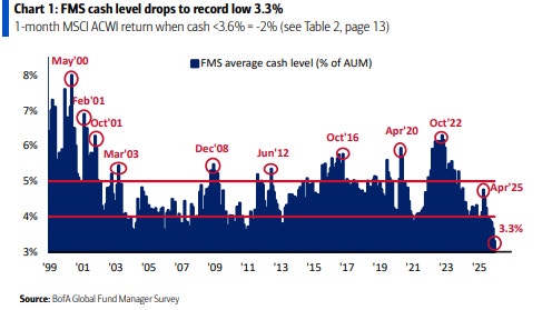 Andelen kassa har nämligen inte bara sjunkit under 4-procentsstrecket, vilket brukar pekas ut som en säljsignal för den som vill vara motvalls, utan den har nått en rekordlåg nivå under mätningens historia. Nu är andelen nere på 3,3 procent.