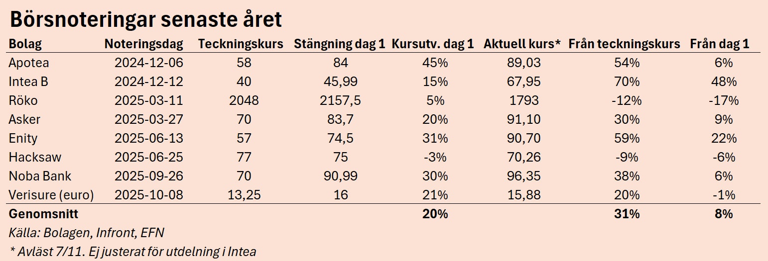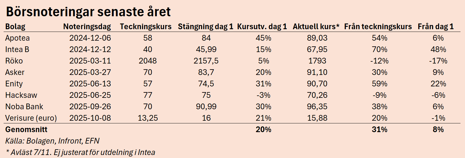 Intressant att notera är att den som har tecknat sig för aktier med ett mer långsiktigt perspektiv i samtliga noteringar har fått en ännu större belöning. Räknat från teckningskursen fram till aktuell kurs har en korg med de här åtta bolagen gett en avkastning på 31 procent.