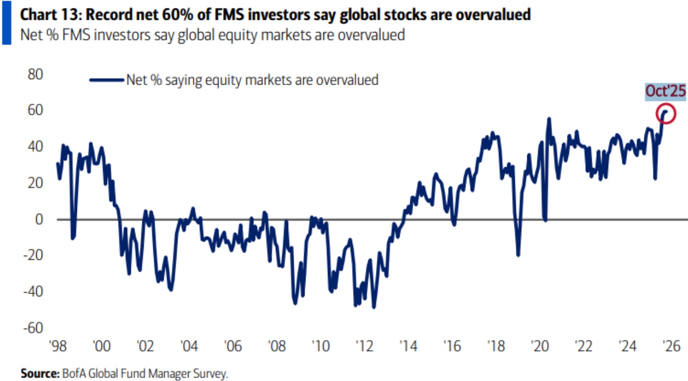 Det är en rekordnivå under enkätens historia och inte ens under uppbyggnaden till IT-bubblan var lika många inne på att börsen var övervärderad.
