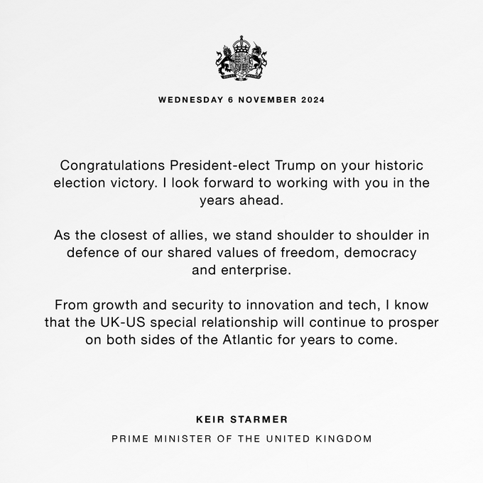 Keir Starmer, Storbritanniens premiärminister: "Som närmast allierade bör vi stå sida vid sida i vårt försvar av våra gemensamma värderingar när det gäller frihet, demokrati och företagsamhet"