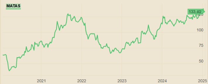 Om vi börjar med börsutvecklingen så ser det bra ut på sistone. 2024 blev ytterligare ett positivt börsår där Matasaktien steg med 17 procent, efter den starka comebacken 2023 som bjöd på ett lyft om 66 procent.