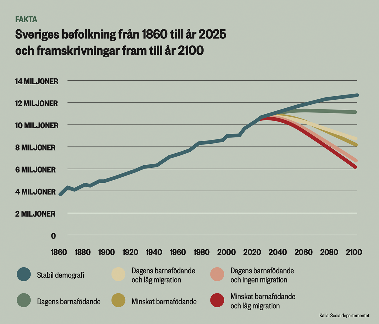 På kort sikt sjunker försörjningskvoten, hur många varje förvärvsarbetare måste försörja, eftersom färre barn behöver välfärdstjänster. Men sedan på sikt, när de större årskullarna slutar jobba och blir gamla och sjuka och färre kommer in i arbetsför ålder, vänder det och blir en ökad försörjningskvot för den arbetande befolkningen. I en delrapport har Åsa Hansson presenterat flera scenarier. I det mest extrema, där invandringen hålls låg och födelsetalen fortsätter sjunka till OECD:s lägsta nivå, minskar Sveriges befolkning med fyra miljoner personer till 2100.