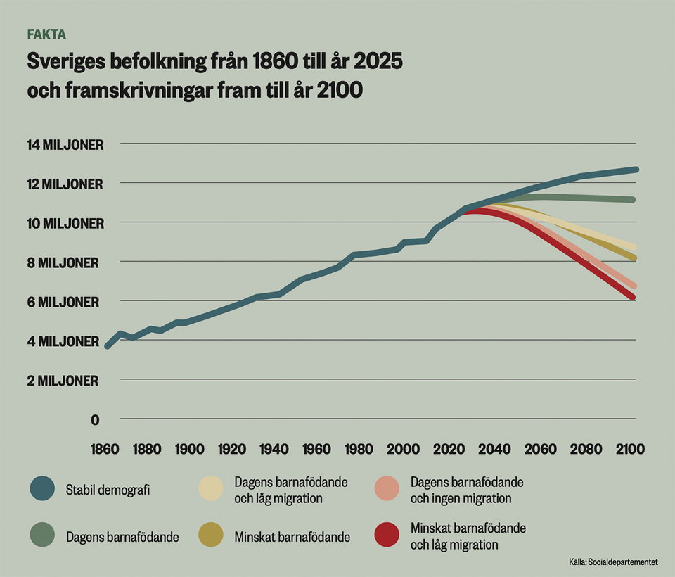 – I ett värsta scenario, med en summerad fertilitet på 0,72, behöver varje förvärvsarbetande försörja 1,6 personer utöver sig själv, jämfört med dagens 0,77 personer.