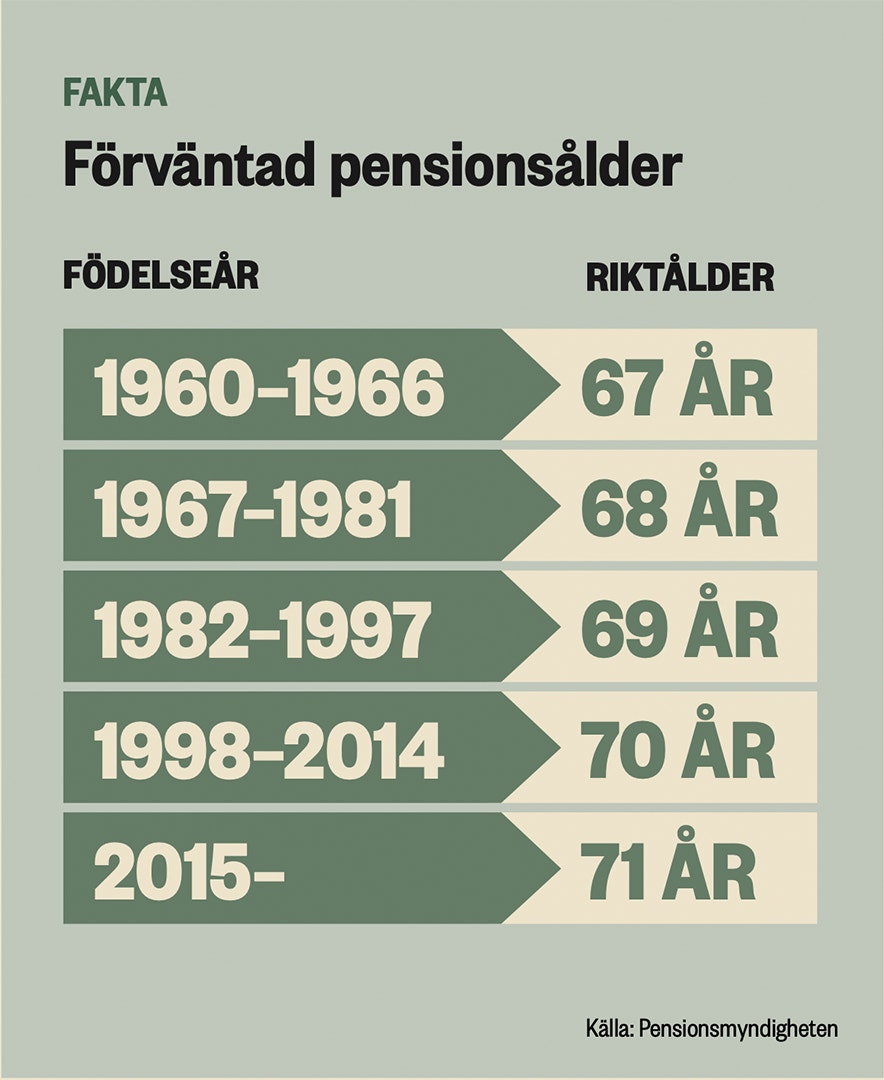 Trots det behöver fler arbeta längre, menar Lisa Laun, som i fjol avslutade en statlig utredning i frågan. Även om medellivslängden stigit kraftigt har den genomsnittliga åldern för när människor börjar ta ut sin pension under lång tid bara ökat marginellt. För att uppmana till senare pensionsuttag infördes en riktålder – en rekommendation som justeras allt eftersom medellivslängden ökar.