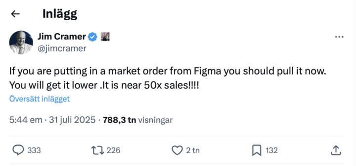 ”Om du lägger en marknadsorder från Figma bör du dra den nu. Du kommer att få den lägre. Det är nästan 50 gånger försäljningen!!!!”, skrev programledaren och den före detta hedgefondförvaltaren cirka två timmar efter börsöppning igår.