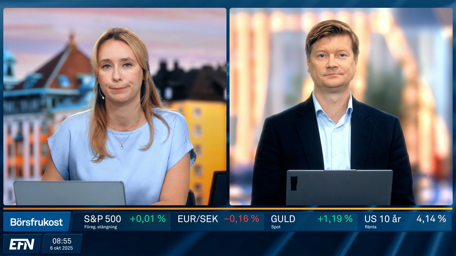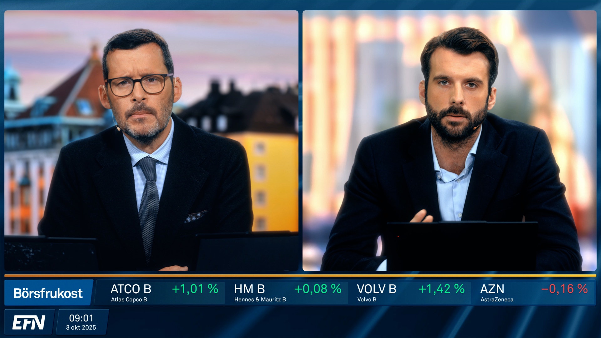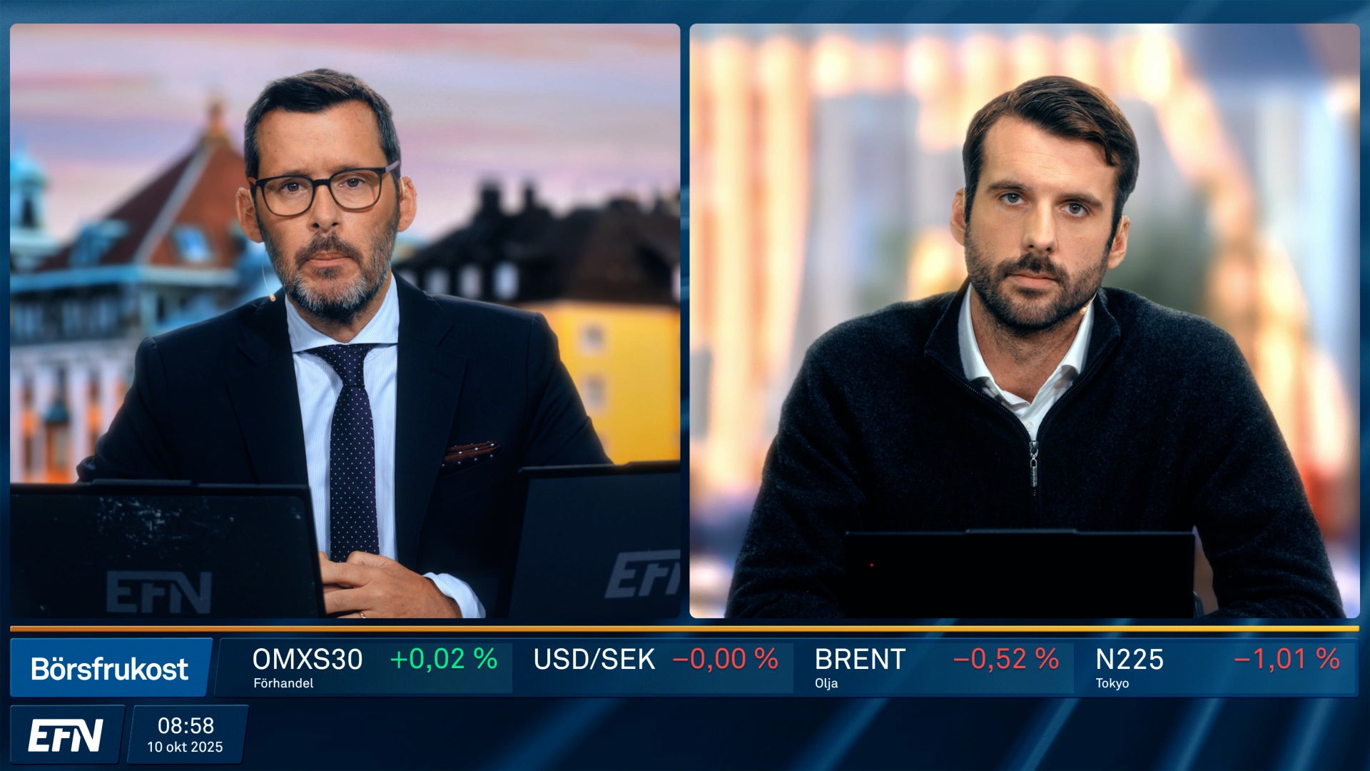Börsfrukost ger dig de senaste bolagsnyheterna och börsöppningen live. Dagens börsrörelser och marknadens viktigaste händelser kommenteras och analyseras av EFN:s och Finansmagasinets egna programledare och analytiker. Varje vardag 08.55 på EFN.se.