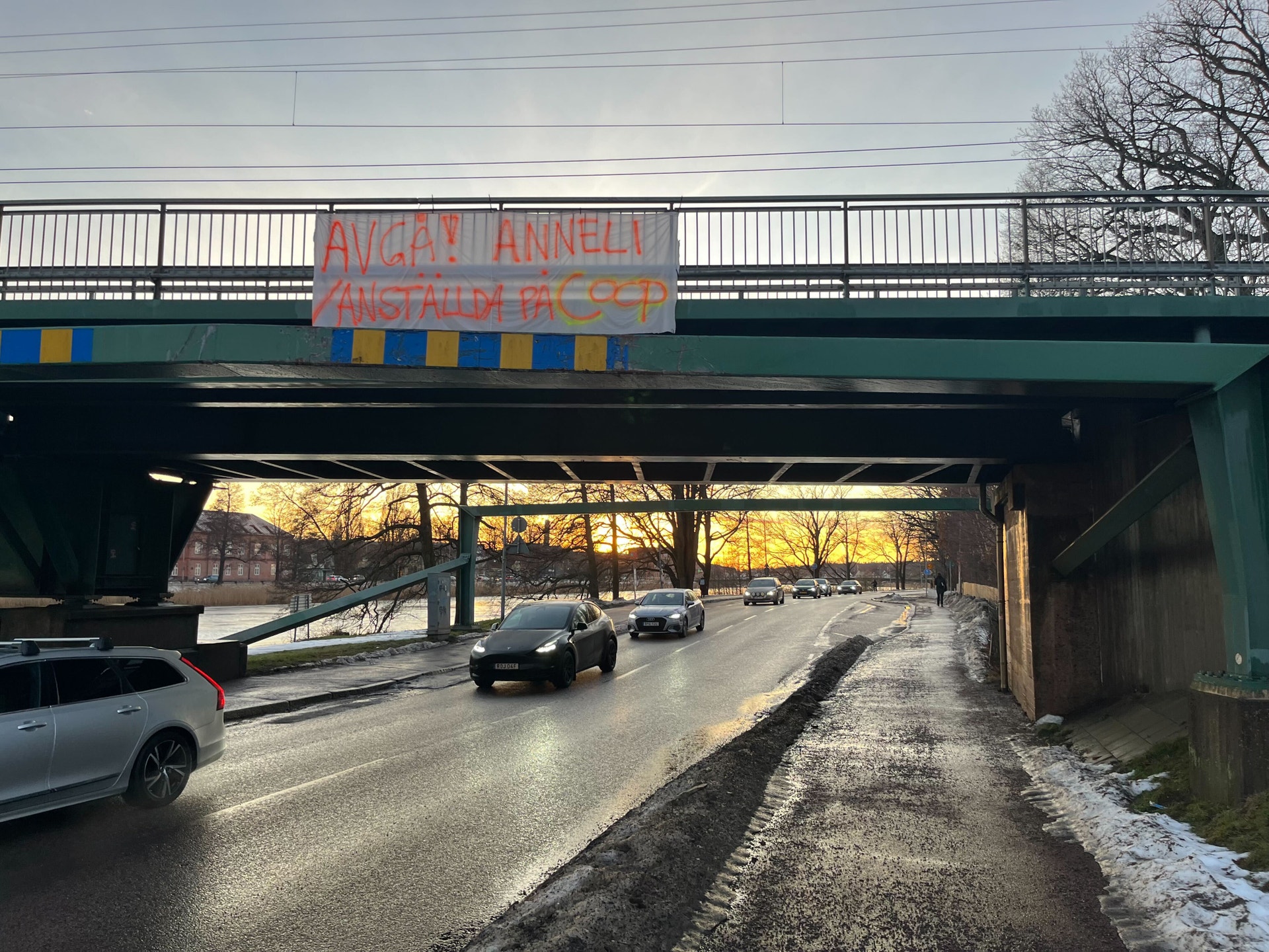I centrala Karlstad har någon satt upp en banderoll över vägen, med texten: ”Avgå Anneli/Anställda på Coop”.