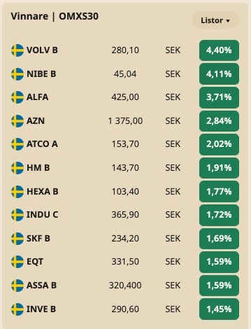 Bland de bolag som går bäst på OMXS30 hittas mycket verkstad, bland annat Volvo, Alfa Laval och Atlas Copco som alla är upp mellan 2-4 procent.