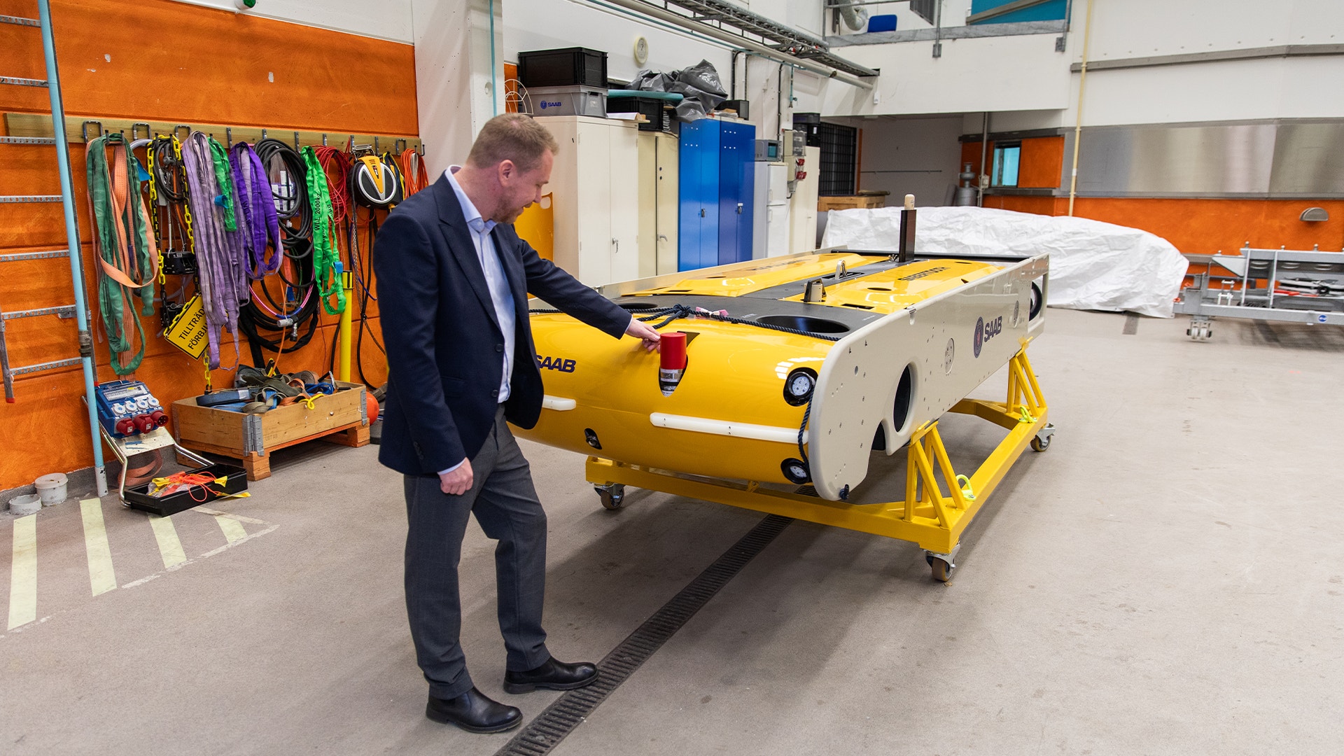Intervjuerna gör vi i en hall där en annan typ av farkost är uppställd, visserligen gul den också, men för helt andra syften än Mumnsen. Den heter Sabertooth, och kan antingen vara självgående eller styras på distans för att inspektera, underhålla och reparera infrastruktur på havsbotten. Som när mystiska fartyg titt som tätt verkar råka ha av till exempel telekomkablar på Östersjöns botten. Sedan 2023 har, enligt tidningen The Economist, minst elva sådana kabelbrott skett, vilka misstänks vara sabotage från det vi kallar den ryska skuggflottan.