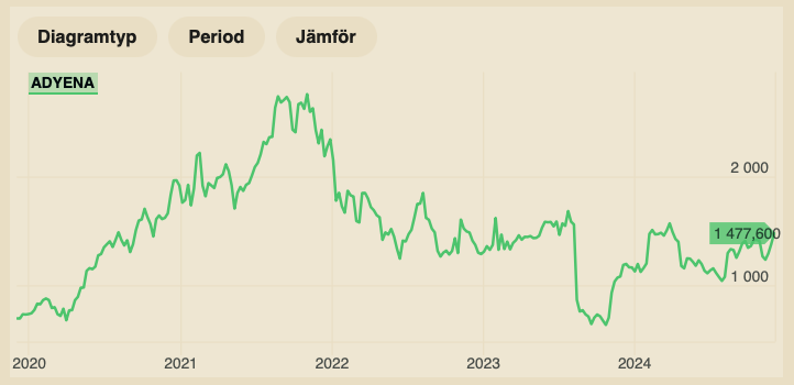 Aktien handlas kring 1 500 euro. Som högst har aktien noterat cirka 2 750, vilket var i samband med den i efterhand absurda perioden år 2021.