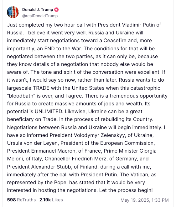 I ett inlägg på Truth Social skriver Donald Trump att han anser att samtalet "gick väldigt bra" och att förhandlingar om vapenvila mellan Ryssland och Ukraina "kommer att inledas omedelbart" för att nå ett slut på kriget.