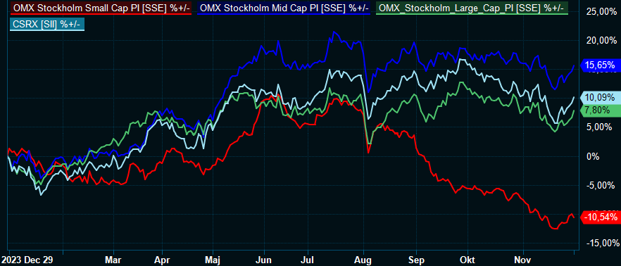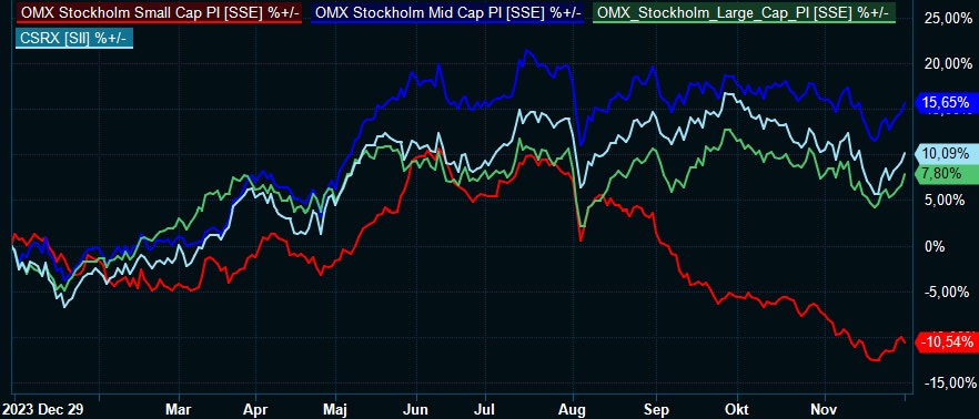 Och ritar vi upp en graf över årets kursutveckling för börsens egna storleksklasser (där mellanstora bolag har 150 miljoner euro till 1 miljard euro i börsvärde och storbolagen minst 1 miljard euro) tillsammans med Carnegies småbolagsindex CSRX så syns det tydligt hur hård motvind som möter de allra minsta.