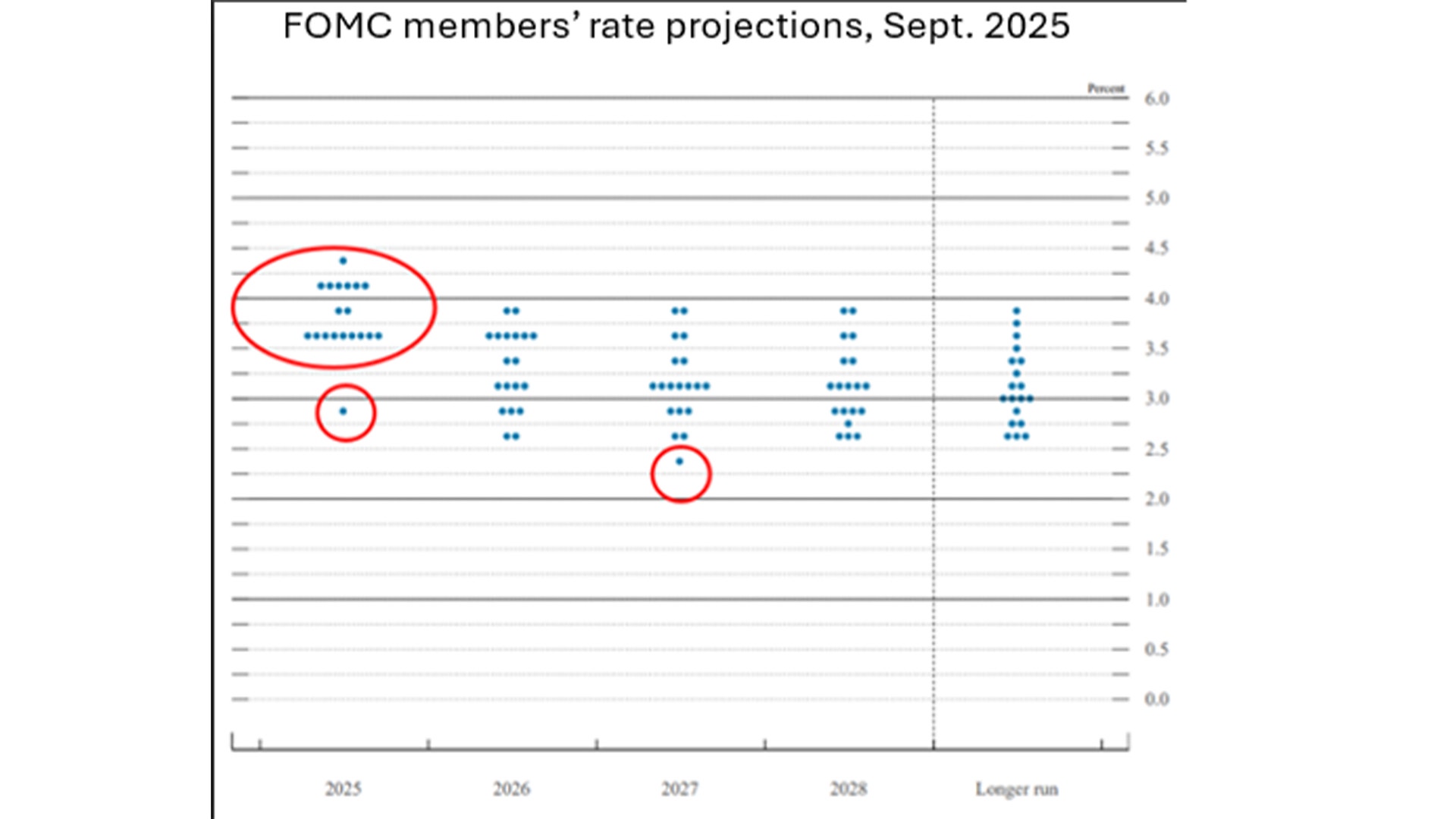 En Fed-ledamot sticker ut i sin prognos, och tror att räntan kommer att sänkas med 125 punkter. Nämligen den Trump-lojale Stevan Miran. Han röstade även mot majoriteten och för en sänkning på 0,5 procent. Michelle Bowman och Christoffer Waller, som vid föregående Fed-omröstning röstade för räntesänkningar, höll sig denna gången till direktionens linje.