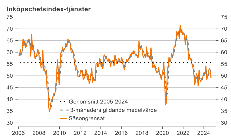 Tjänstesektorn har varit i tillväxtzonen, alltså över 50, tre månader i rad. Men noterar nu alltså en nedgång till 49,1 i september.