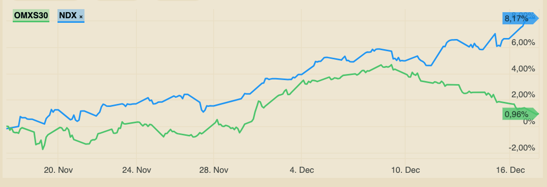 I början på december var förhållandet plötsligt det motsatta. Stockholmsbörsen gick bra medan USA-börsen gick dåligt. Flera pratade om de höga värderingarna på amerikanska techbolag och sa att Stockholmsbörsen såg billig ut i jämförelse.