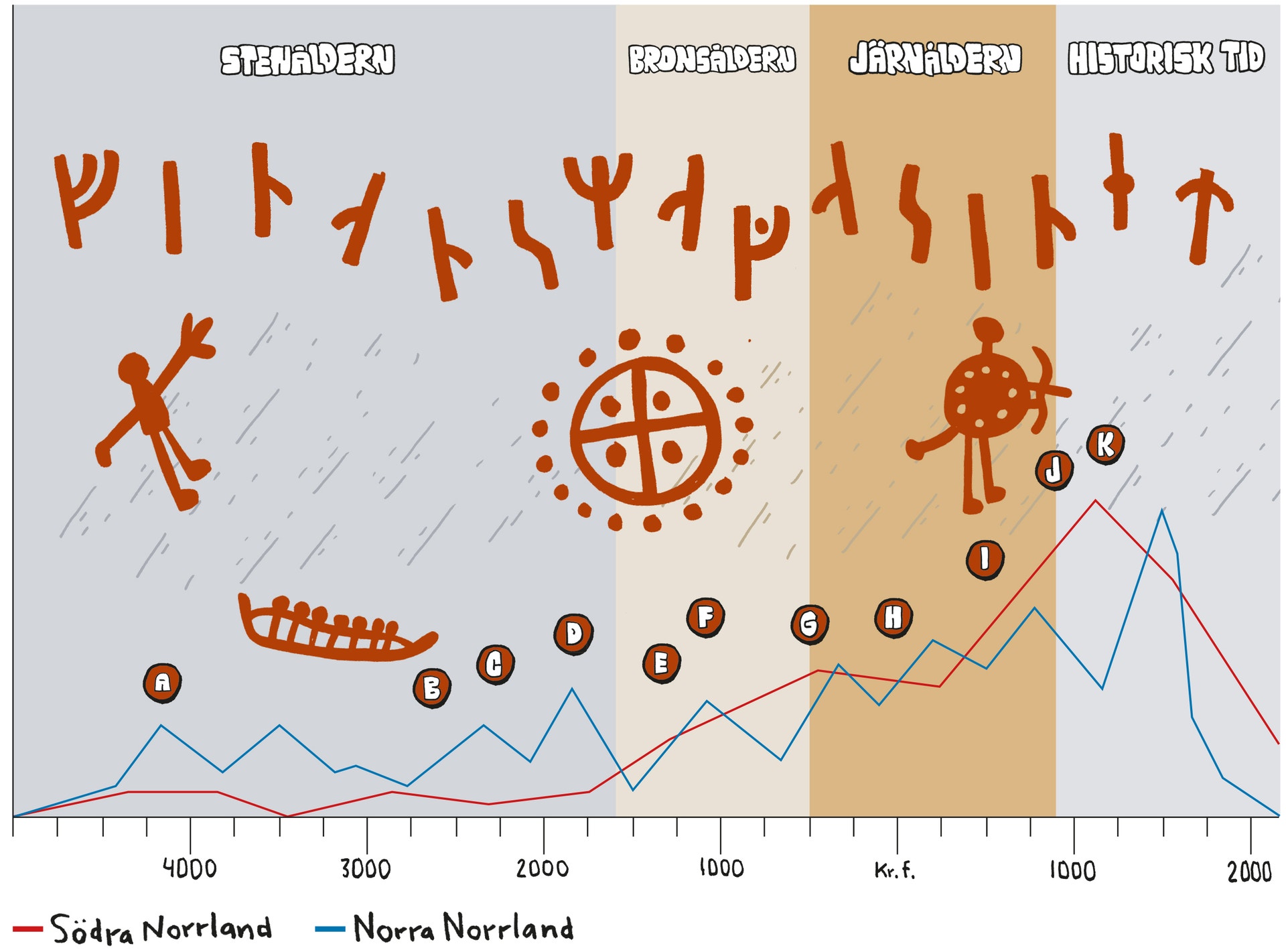 I södra delen ser vi en jämn kurva som tycks stämma väl med utvecklingen i södra Sverige, med en befolkningsökning från slutet av stenåldern, uppkomsten av småkungadömen och ett första större Sveavälde under bronsåldern. En nedgång kom med koppar och tennhandelns sammanbrott vid bronsålderns slut. Sedan följer en jämn uppgång under järnåldern fram till forntidens slut. Kurvan är så jämn, och överensstämmer så väl med utvecklingen i södra Sverige – särskilt befolkningsutvecklingen – att det finns skäl att anta ett samband. Mycket talar för att huvuddelen av skinnexporten från Dalarna och södra Norrland gick söderut, till grannregionerna.