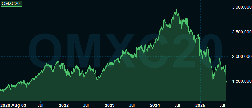 En illustration av det är kursgrafen på Köpenhamnsbörsen som nu nosar på flera år gamla bottennivåer, samtidigt som många andra börser är på eller nära sina toppnivåer.