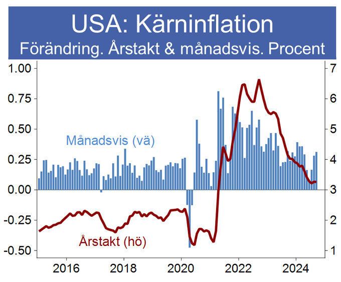 ”Känns riktigt svårt att bli upphetsad över USA:s nya kärninflationsutfall (3.3% i årstakt i okt - förv 3.3%) när DT är på väg in i Vita huset 20 jan, efter tydligt valutfall och med trolig ekonomisk supermakt. Många osäkra parametrar just nu! Alla sitter i Trumps väntrum!”, skriver han på Twitter.