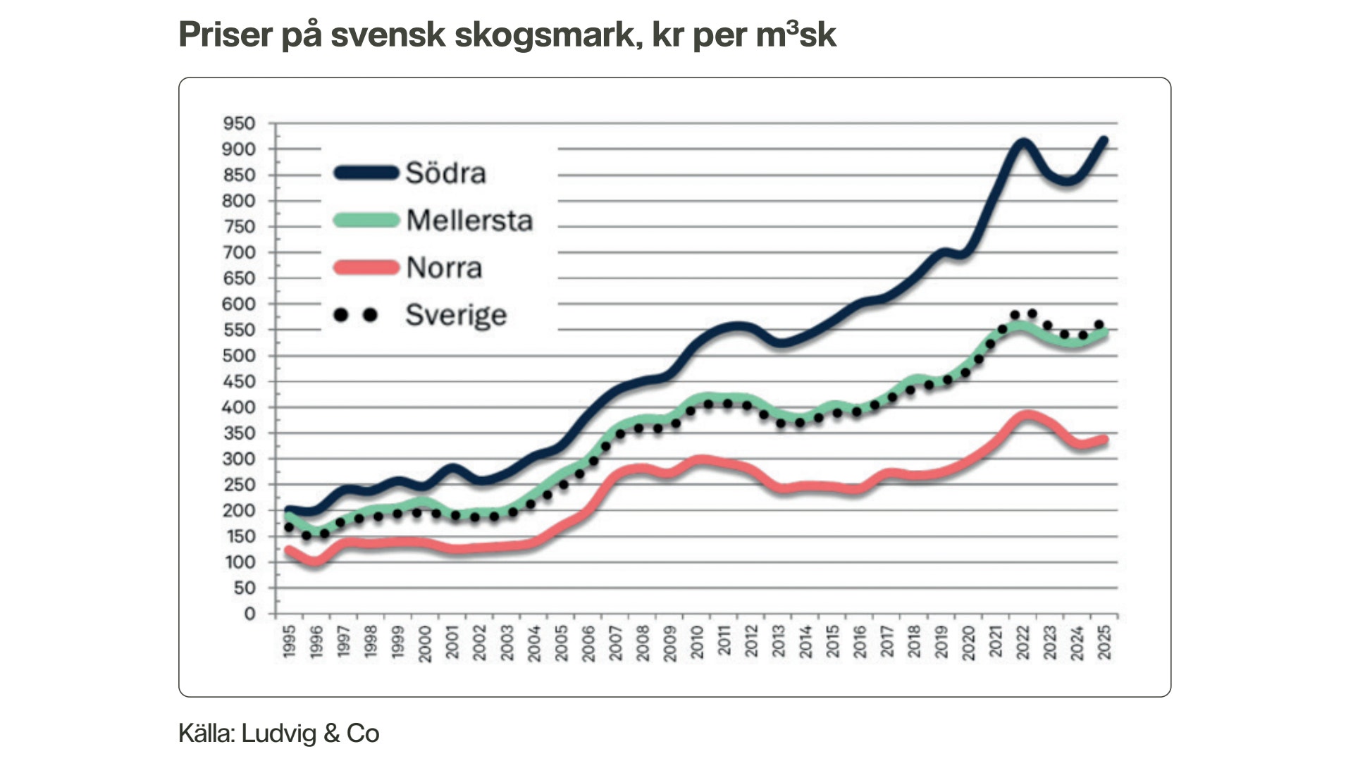 – När virkesprisernas utveckling skiljer mellan olika regioner blir det än viktigare att planera sina skogliga åtgärder utifrån lokala förutsättningar. Trots att virkespriserna varierar ser vi att skogsmarkspriserna håller sig stabila. Det visar på det långsiktiga värdet av skog och den starka konkurrensen om mark i stora delar av landet, säger Linnea Åkerlund, skogsexpert på Handelsbanken.